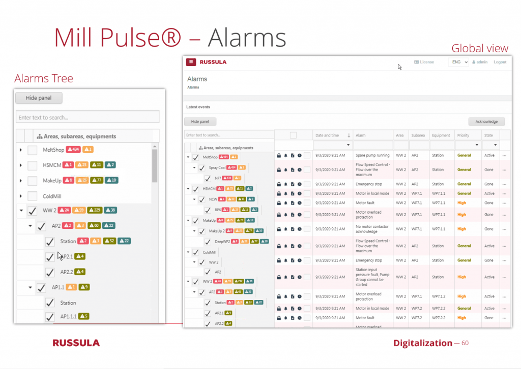 - All information related to change in layout of the rolling mill stands is registered in Mill Pulse® database, so the Historic and Traceability data is built from various dimensions, being able to be contextualized to Production Orders, Events, Delays, and other relevant info about production.
